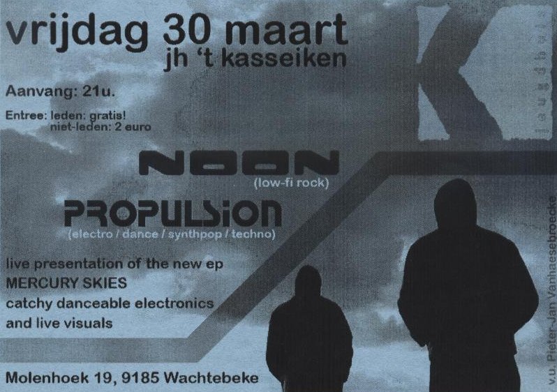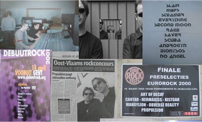 In April 2001 PROPULSION played at ‘Vooruit’, an important venue where many well-known bands had performed before. With their track called ‘No Angel’ released on the Debuutrock CD, they had airplay on radio Studio Brussel (national ‘alternative’ radio). Many gigs followed all over, mostly, the Flemish part of Belgium and even abroad at the Netherlands.